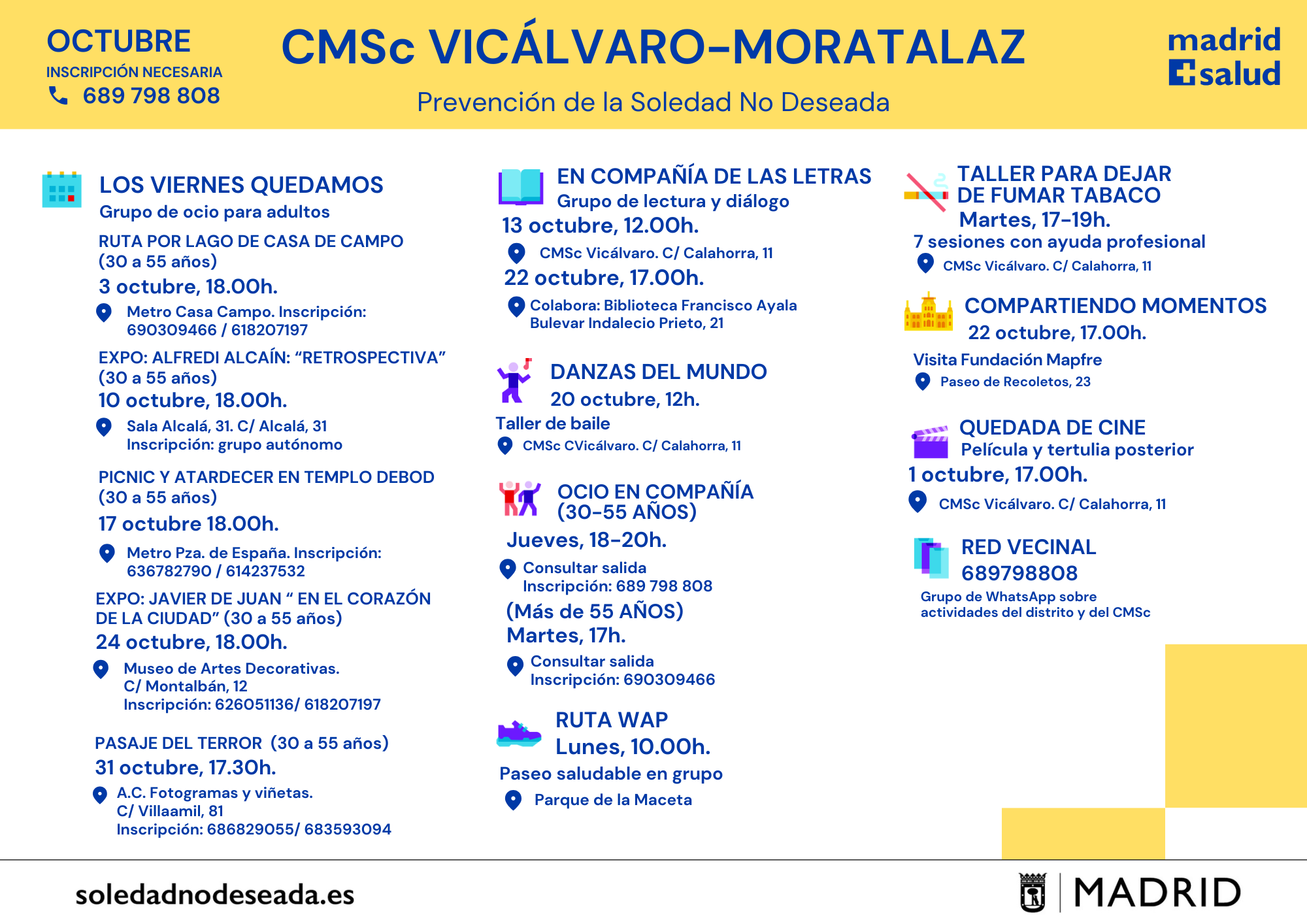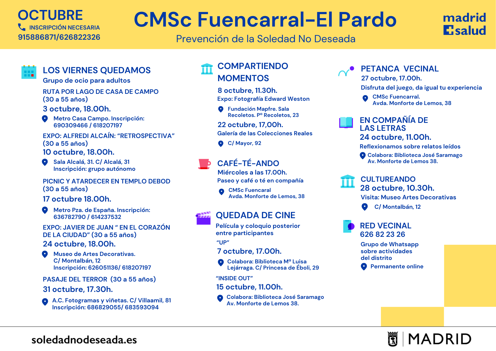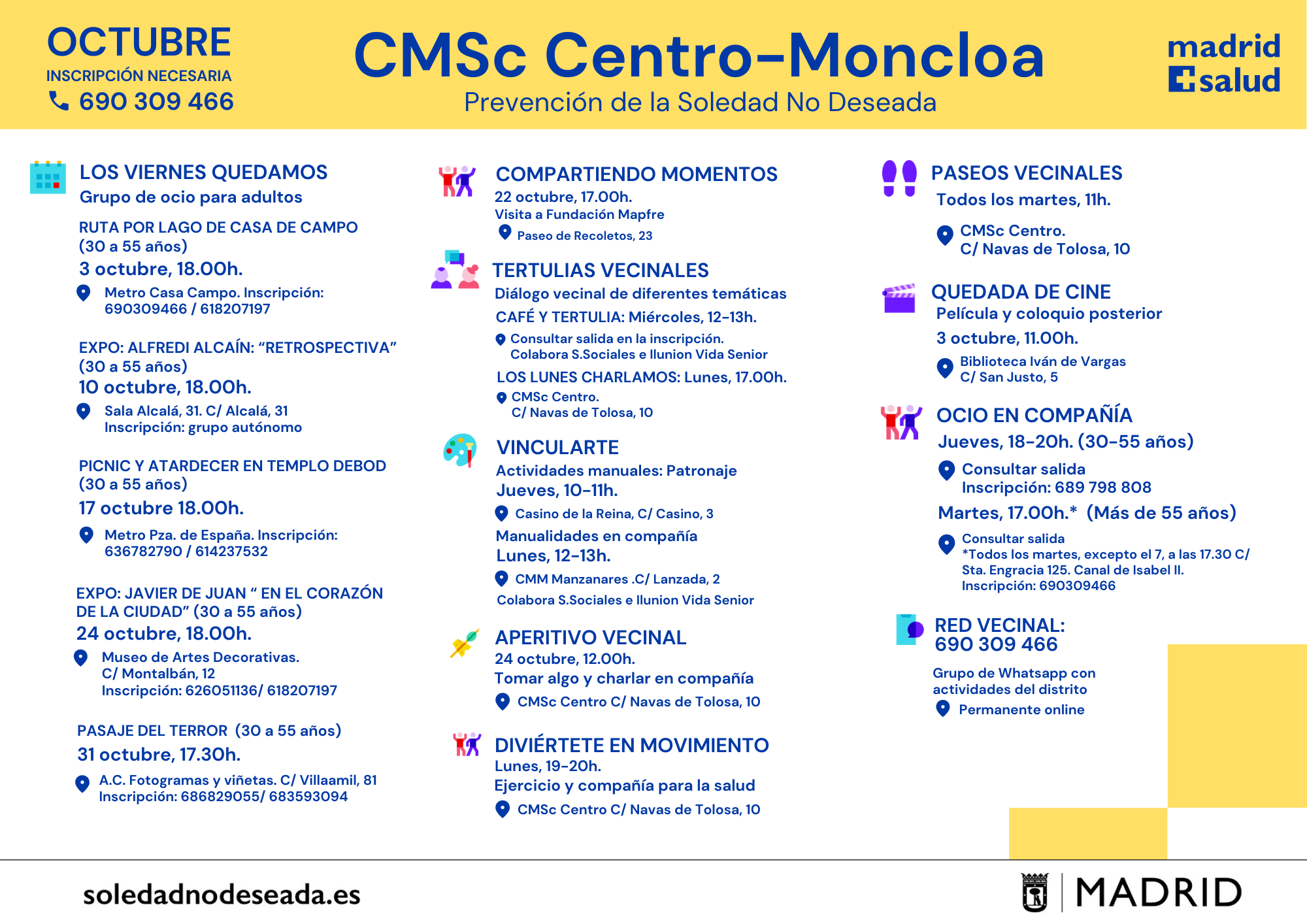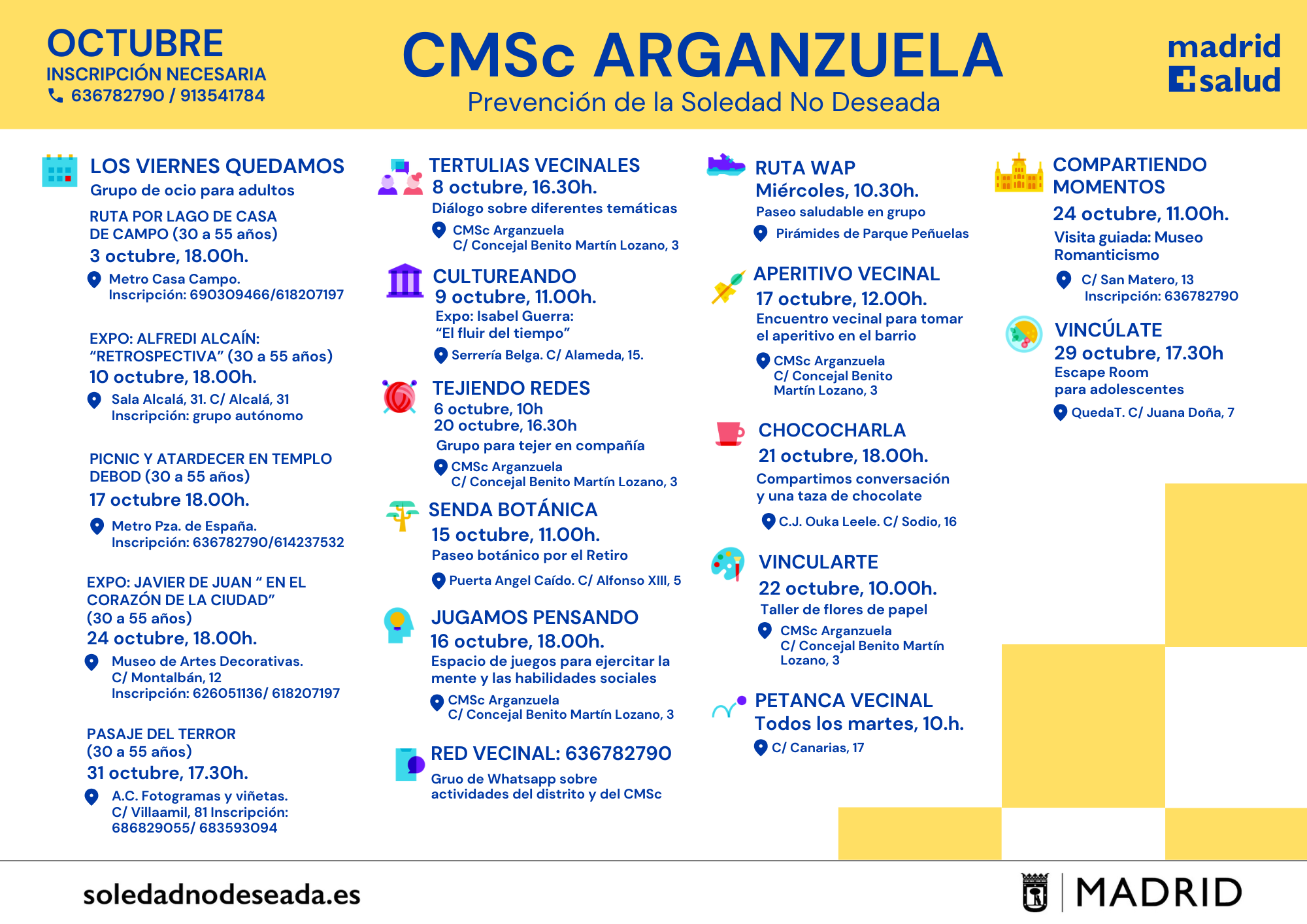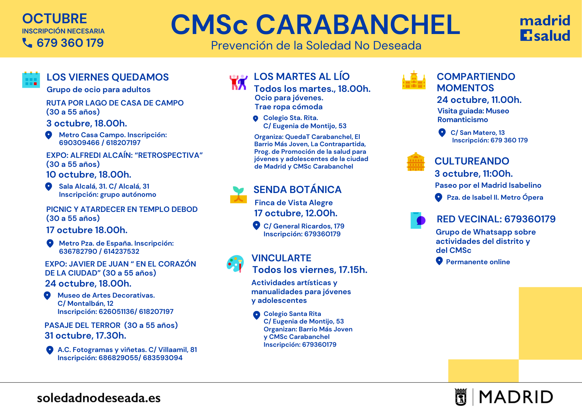 Actividades en los Centros Municipales de Salud comunitaria Arganzuela Carabanchel Carabanchel Centro Joven Centro-Moncloa Centro-Moncloa Chamartín Chamberí Ciudad Lineal Prevención Det. Cognitivo Fuencarral-El Pardo Fuencarral-El Pardo Fuencarral Especial Jóvenes Hortaleza Latina Puente Vallecas Puente Vallecas Salamanca-Retiro San Blas Tetuán Usera Vicálvaro-Moratalaz Vicálvaro-Moratalaz Villa de Vallecas Villaverde soledadnodeseada.es Todos los derechos reservados © 2021