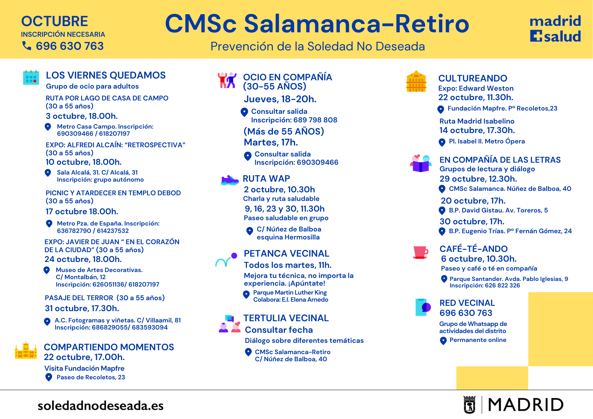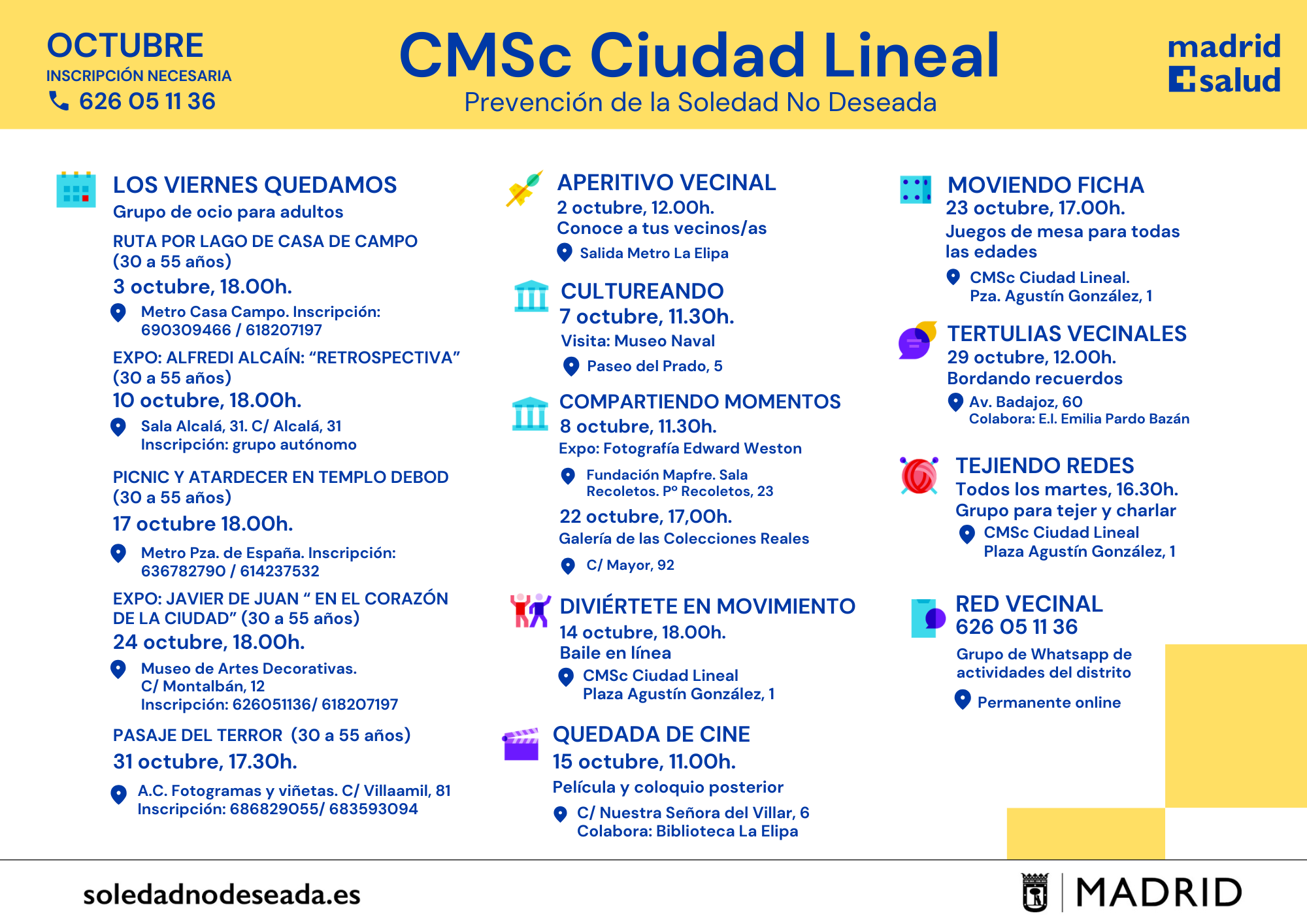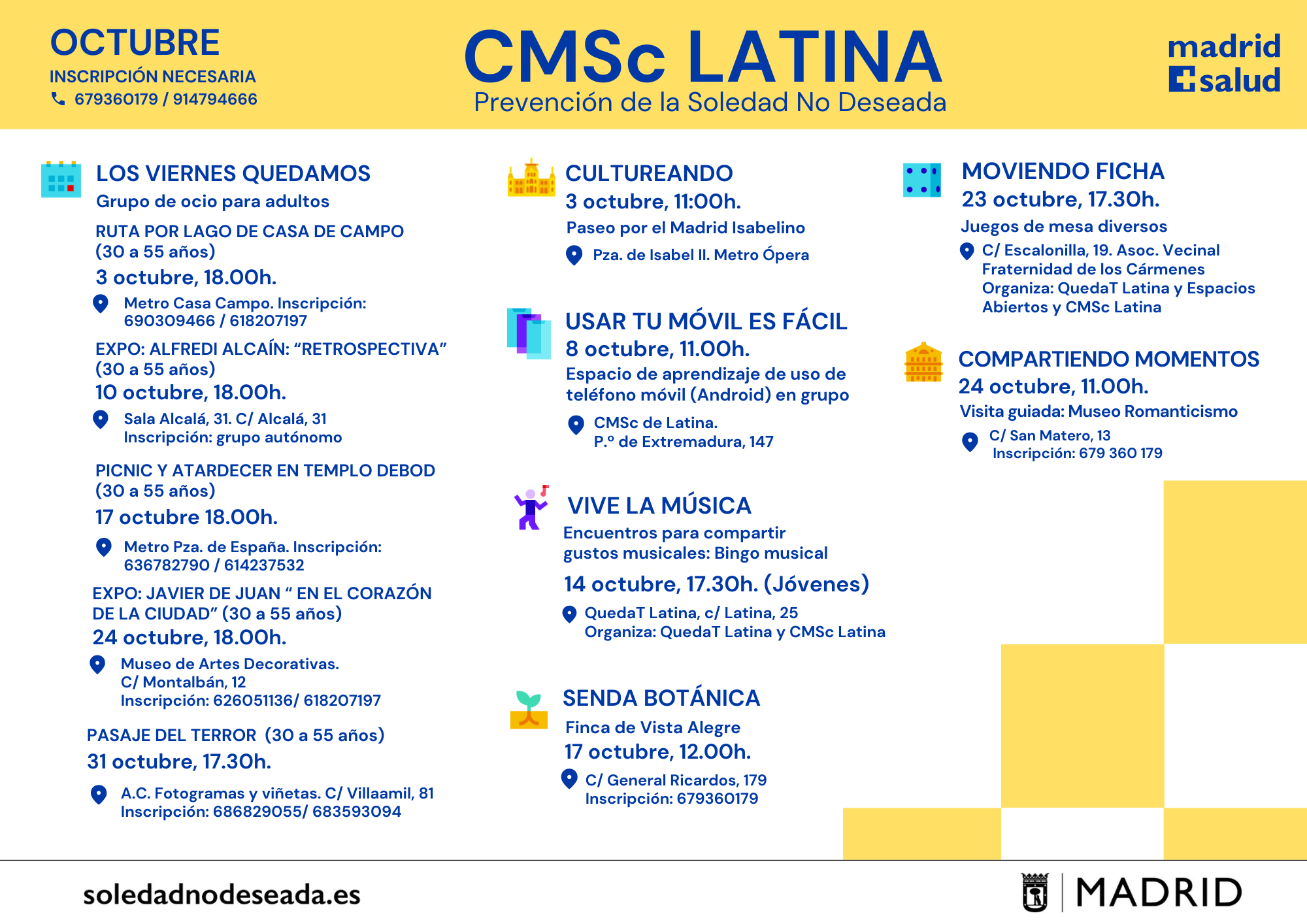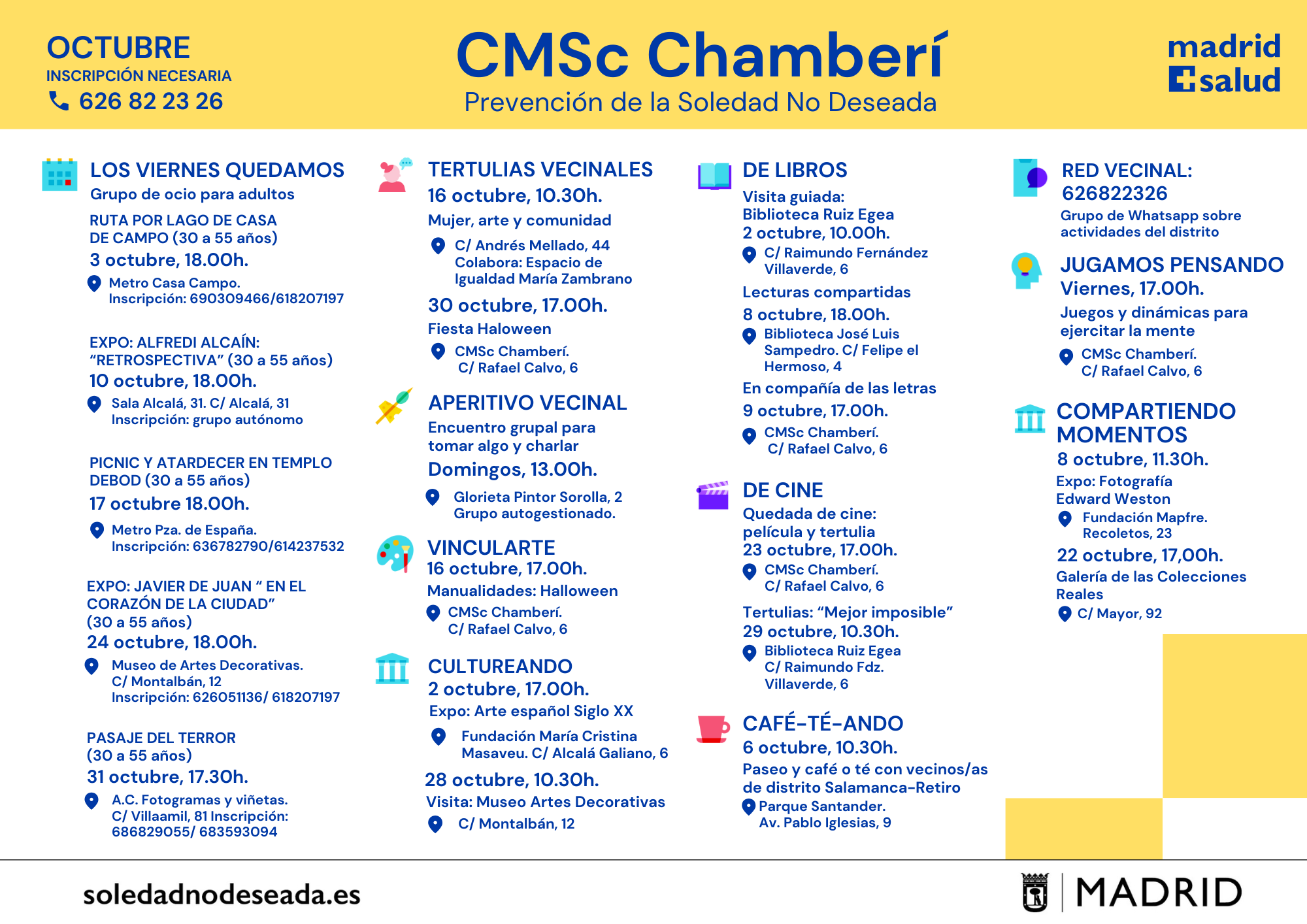 Actividades en los Centros Municipales de Salud comunitaria Arganzuela Carabanchel Carabanchel Centro Joven Centro-Moncloa Centro-Moncloa Chamartín Chamberí Ciudad Lineal Prevención Det. Cognitivo Fuencarral-El Pardo Fuencarral-El Pardo Fuencarral Especial Jóvenes Hortaleza Latina Puente Vallecas Puente Vallecas Salamanca-Retiro San Blas Tetuán Usera Vicálvaro-Moratalaz Vicálvaro-Moratalaz Villa de Vallecas Villaverde soledadnodeseada.es Todos los derechos reservados © 2021