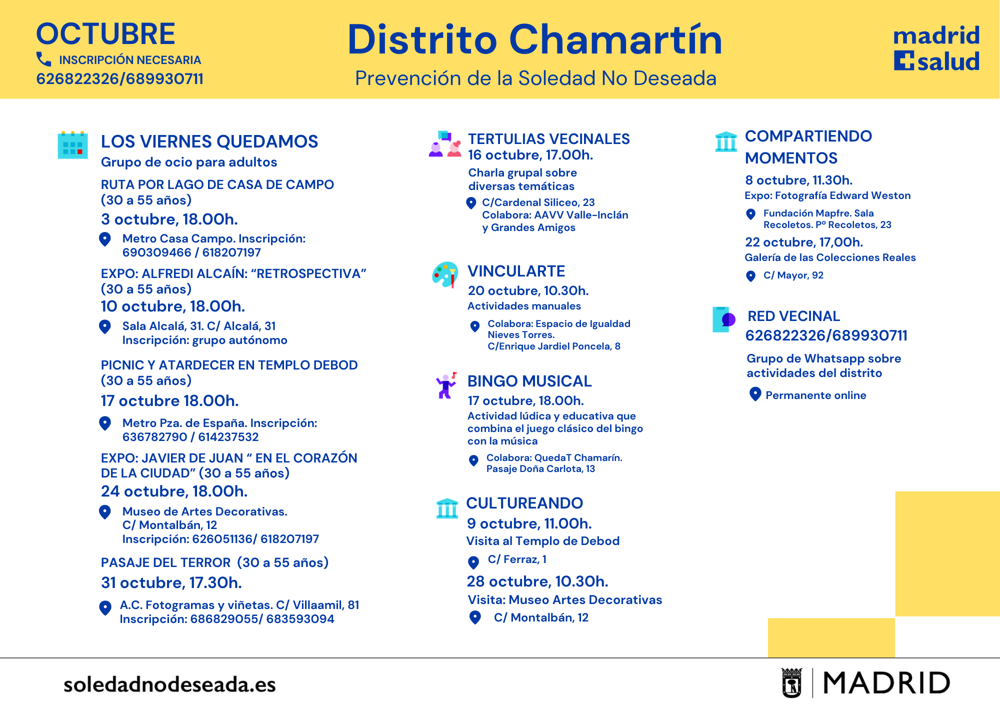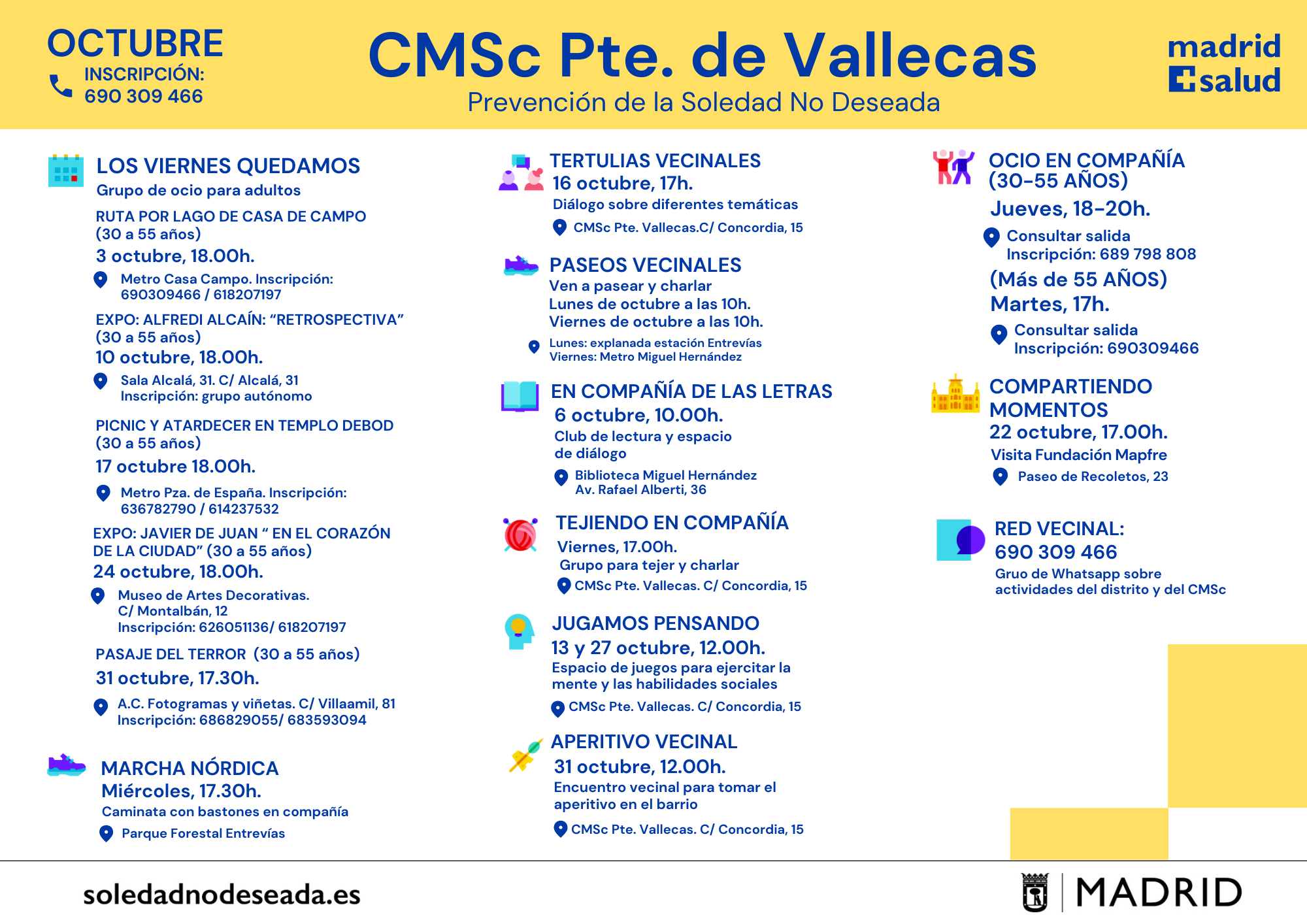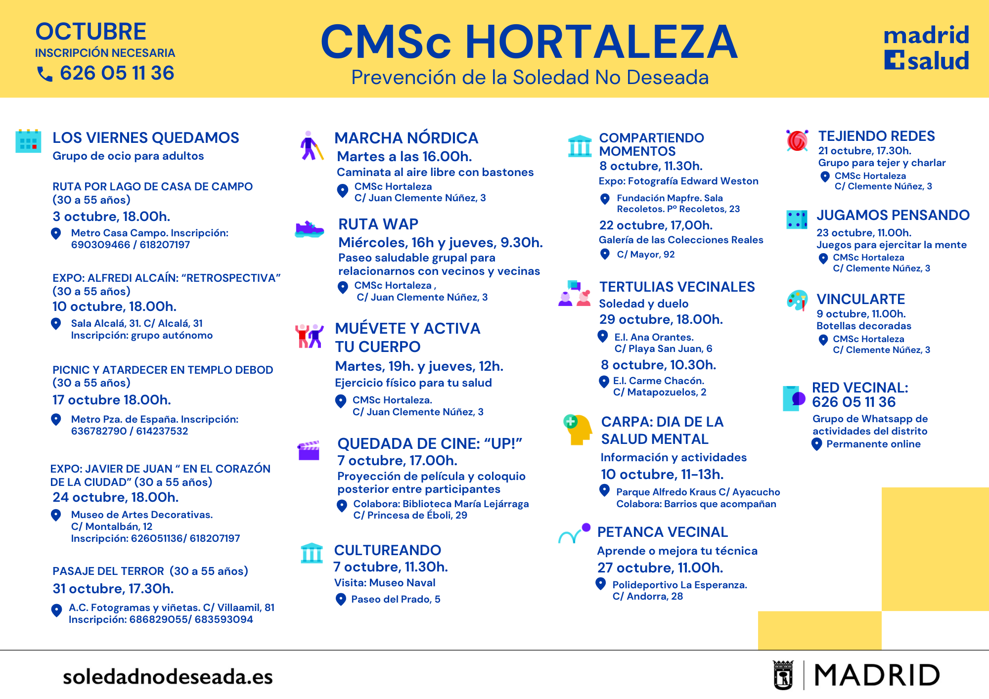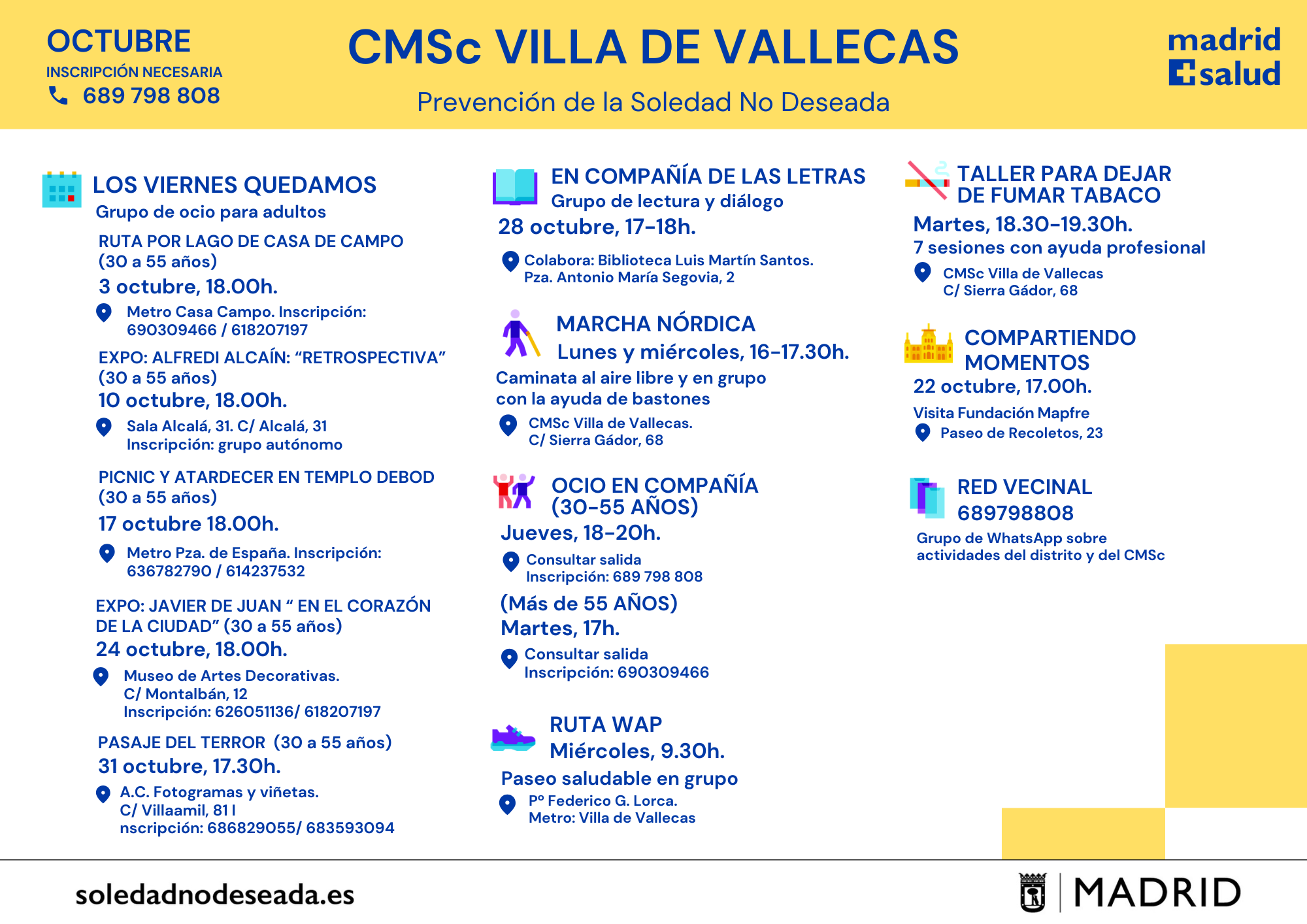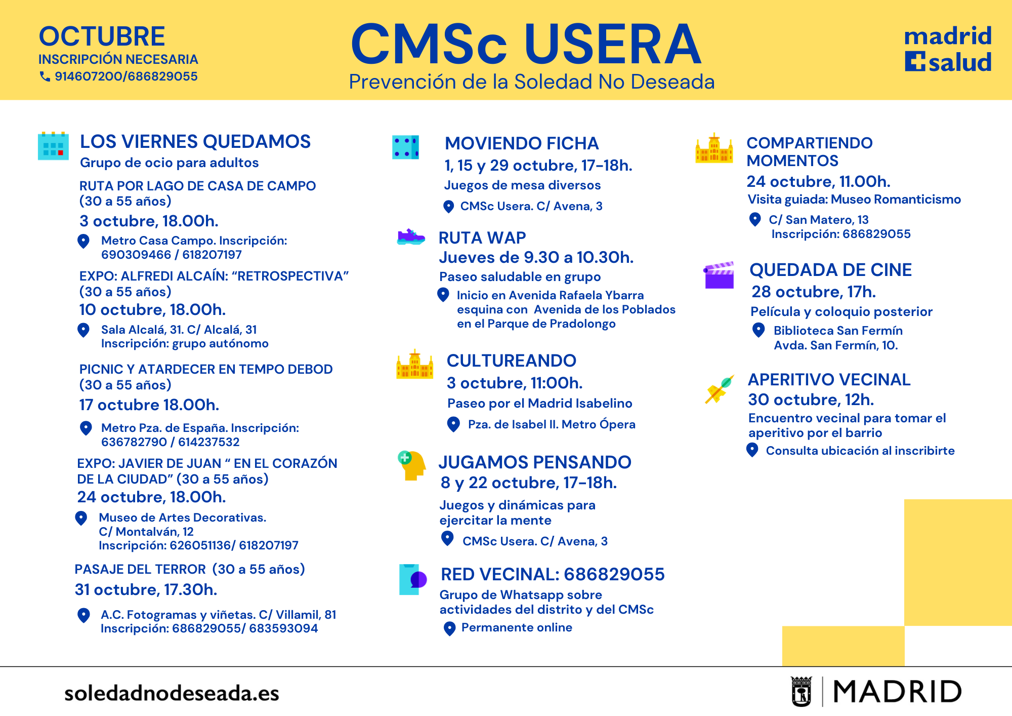 Actividades en los Centros Municipales de Salud comunitaria Arganzuela Carabanchel Carabanchel Centro Joven Centro-Moncloa Centro-Moncloa Chamartín Chamberí Ciudad Lineal Prevención Det. Cognitivo Fuencarral-El Pardo Fuencarral-El Pardo Fuencarral Especial Jóvenes Hortaleza Latina Puente Vallecas Puente Vallecas Salamanca-Retiro San Blas Tetuán Usera Vicálvaro-Moratalaz Vicálvaro-Moratalaz Villa de Vallecas Villaverde soledadnodeseada.es Todos los derechos reservados © 2021