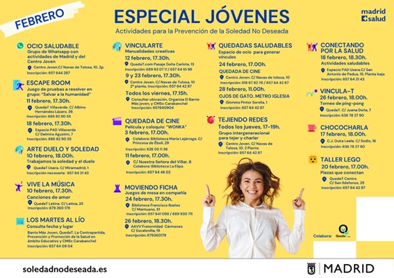 Por eso, desde Madrid Salud y los Centros Municipales de Salud Comunitaria (CMSc), impulsamos durante todo el año una amplia programación de actividades dirigidas a jóvenes, pensadas para generar encuentros reales y prevenir la soledad no deseada desde el ocio, la creatividad, el juego, la cultura y el cuidado mutuo.